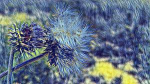 Musk Thistle (Carduus nutans) is an invasive plant native to Europe, Central Asia, and North Africa. In the photo above we see on the left a flower getting ready to bloom, and behind it a bloom already ggone to seed. The yellow in the background are either Coreopsis or Brown Eyed Susans, or both, out of the depth of field.