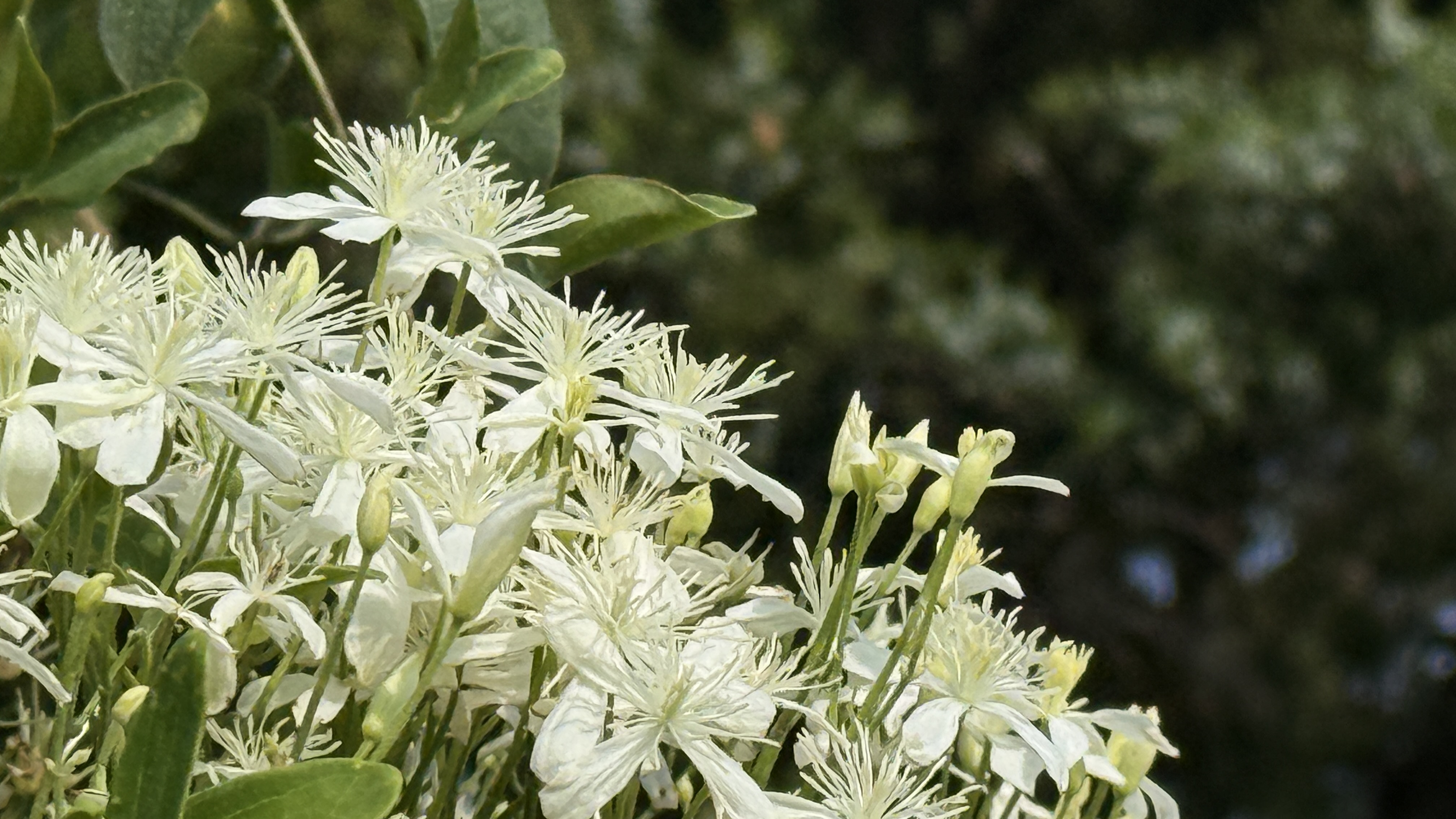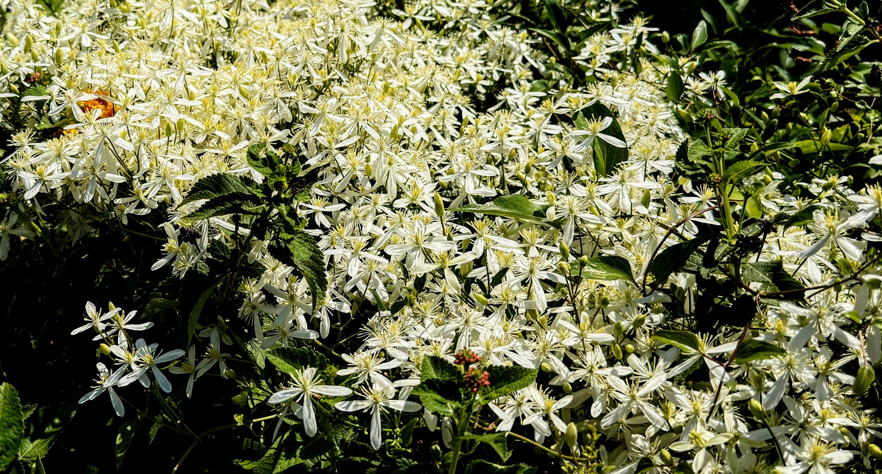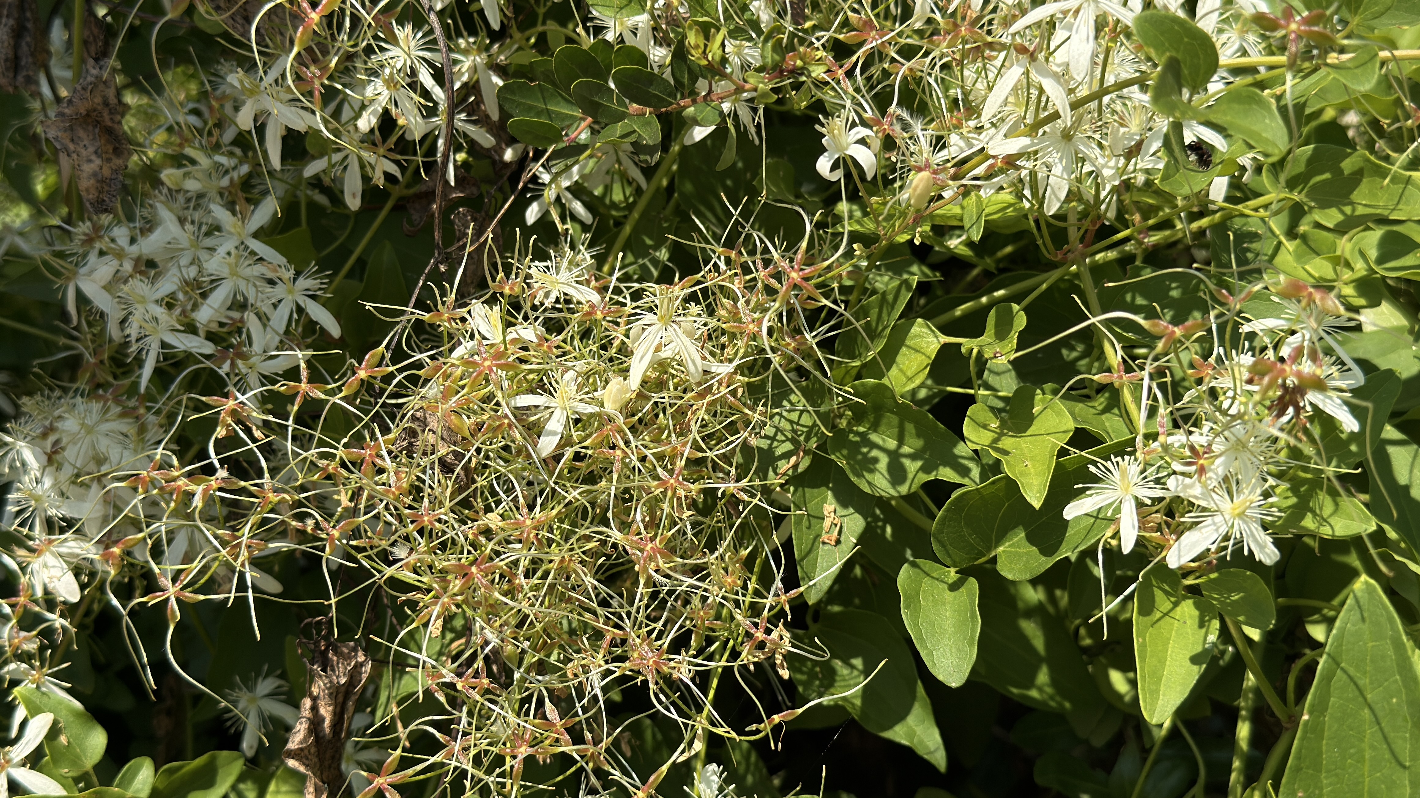 I was pleasantly surprised to find, recently, a different Clematis, native to Central Oklahoma. Clematis terniflora, or Autumn Clematis, as it’s commonly known, is smaller than its Texas cousin, but still provides striking clouds of white flowers and achenes along the roadsides and in ditches. In this case, the flowers provide the show, and the achenes are less showy than those of C. drummondii, as seen in the third photo following: